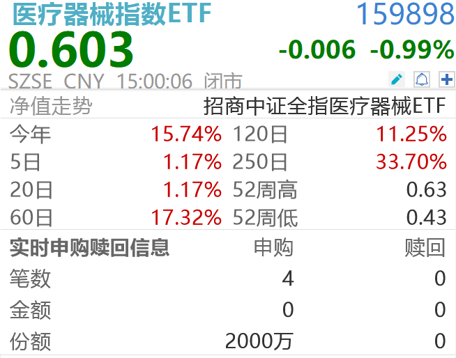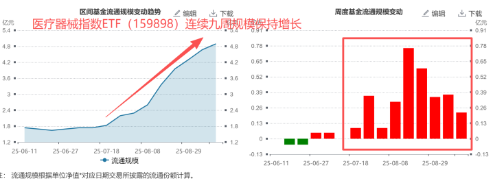 目前跟踪该指数的ETF中,年内涨幅第一的是医疗器械指数ETF(159898):将近16%。该ETF的基金规模已经连续9周保持增长,并且昨日回调期间获得2000万份的大额申购,今日早盘又获得500万份净申购,显示资金“低吸”意愿强烈。