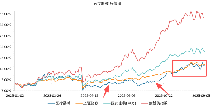 从年内表现来看,中证全指医疗器械指数在8月之前甚至不如大盘走得好,更别提6-7月一路狂飙的创新药。但是临近8月,指数上升斜率明显变陡,在业绩、逻辑、资金的合力下迅速赶超上证指数,目前宽幅震荡暂作修整,可能处于二次启动前的介入良机。